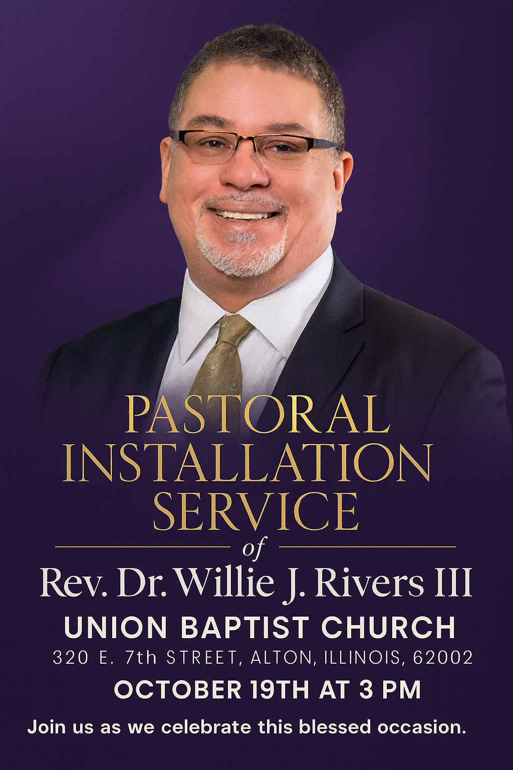 We invite you to join the Historic Union Baptist Church in the installation of Pastor-Elect Reverend Dr. Willie J. Rivers, III on Sunday, October 19, 2025 at 3:00 PM CT.
